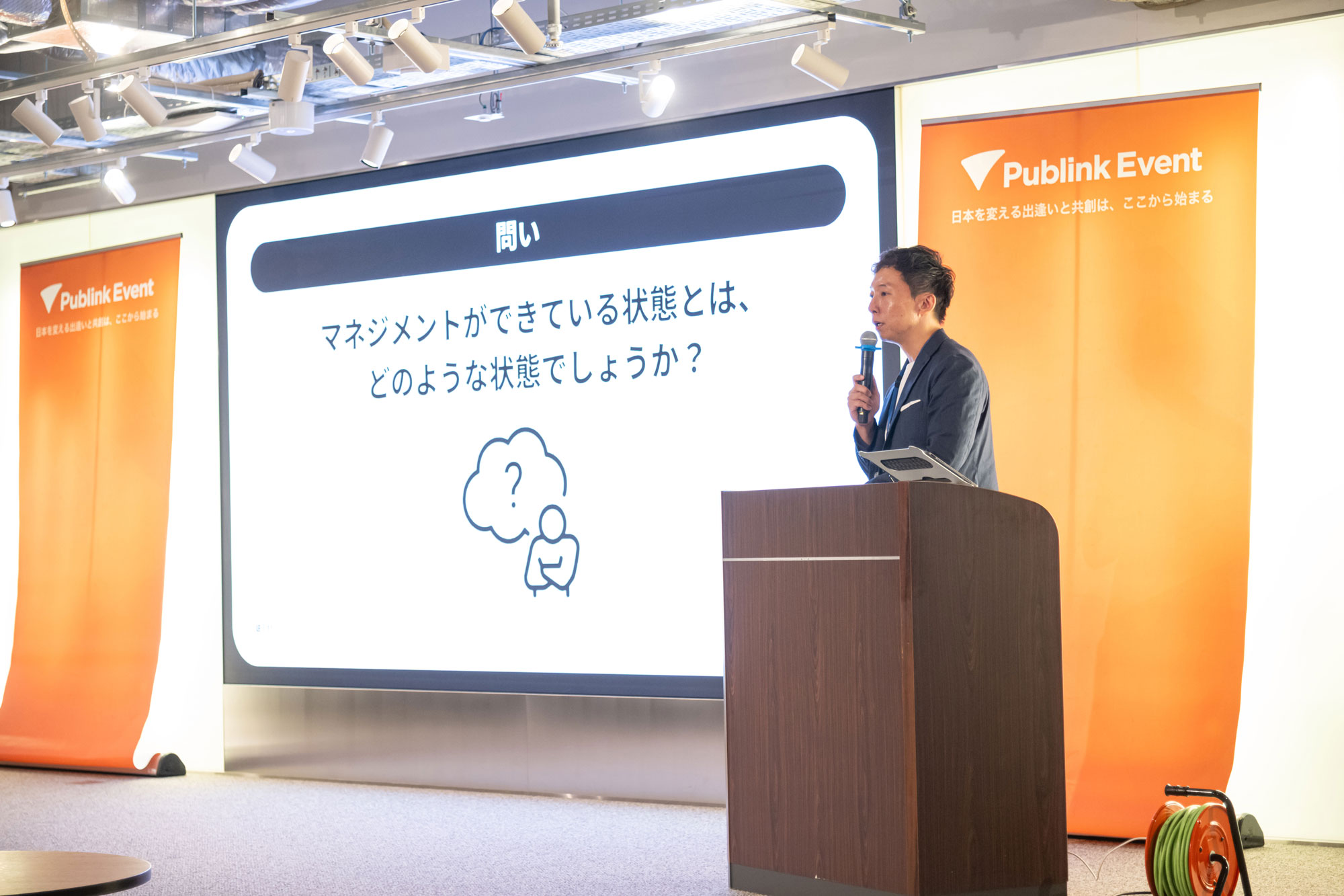 講師は、『急成長を導くマネージャーの型』(Amazonのマネジメント・人材管理カテゴリ1位獲得実績あり、現在も上位にランクイン)著者であり、株式会社EVeM代表取締役CEOの⻑村禎庸氏。長村氏が自身の経験や失敗談を交えながら、「マネジメントができている状態」を定義し、それを実務に落とし込むための「基準の型」を紹介しました。
