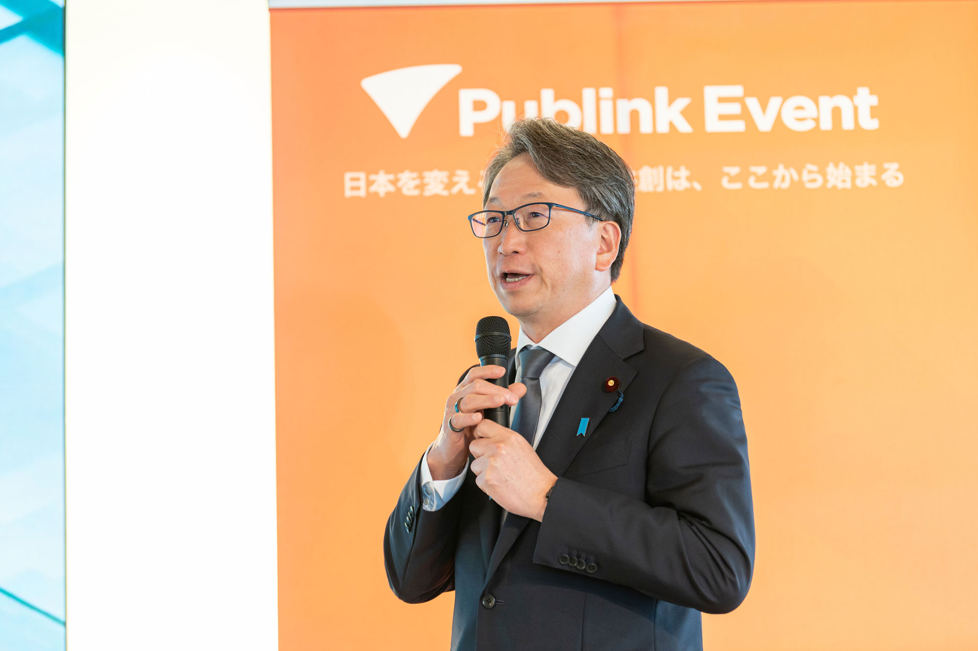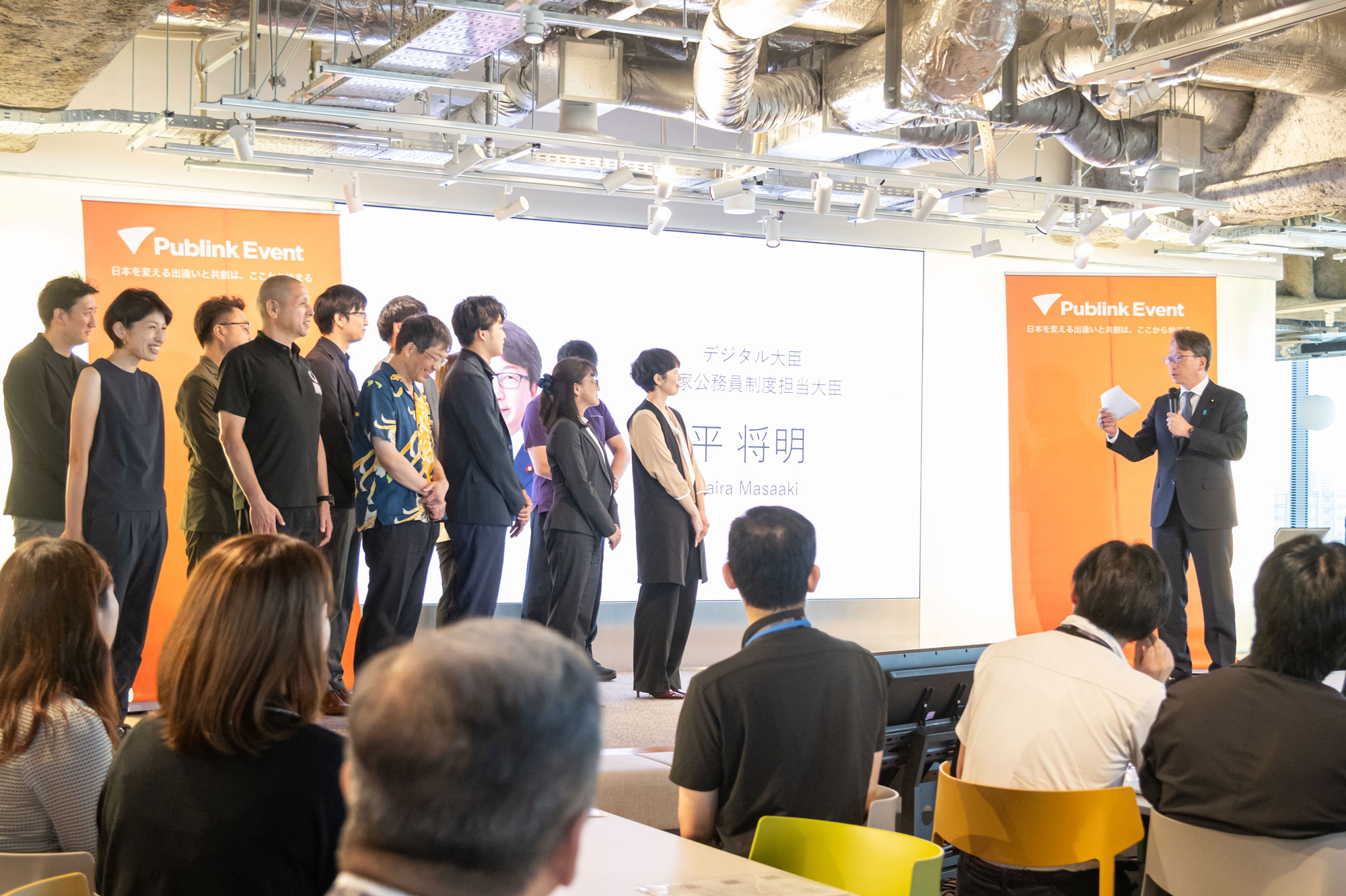 Publink Eventの目玉の一つが、審査員の豪華さ。審査に先立ち、デジタル大臣 国家公務員制度担当大臣 平 将明氏にご挨拶をいただきました。