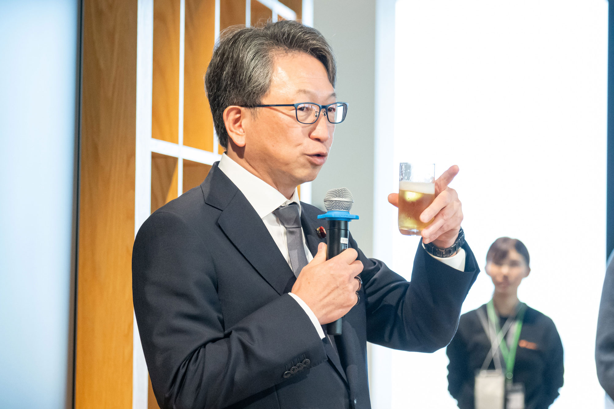 表彰式の興奮も冷めやらぬ中、皆様お待ちかねのミートアップ・交流会がスタート!Publink代表 栫井がビール片手にマイクを取ります。