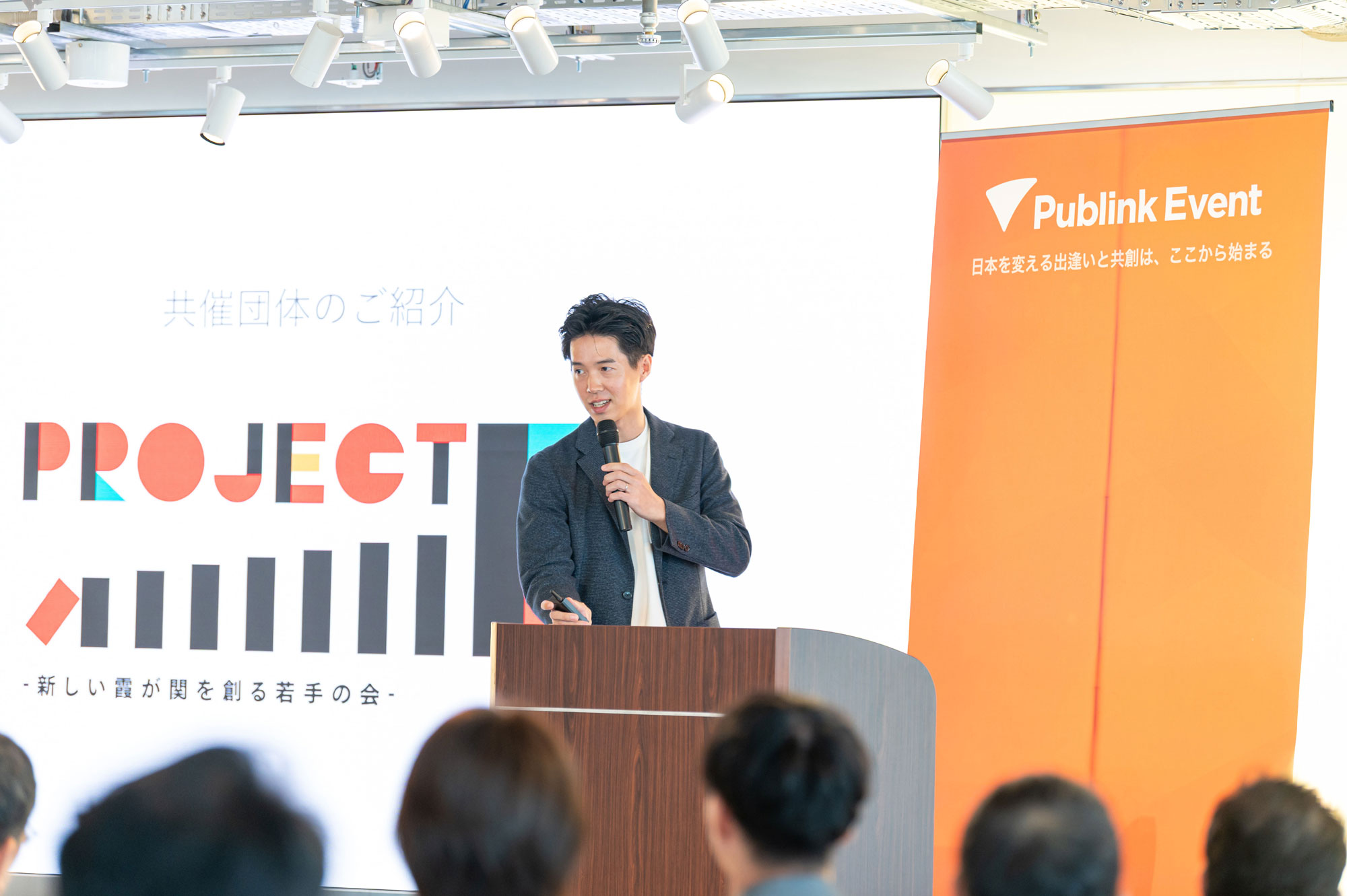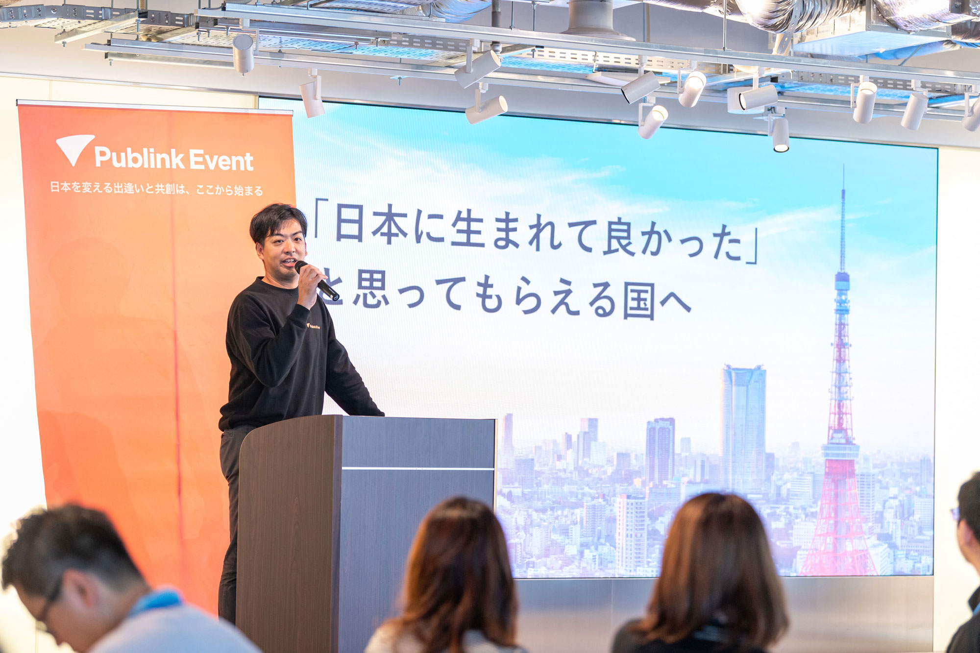 イベントは主催者のPublink(パブリンク)代表 栫井誠一郎の挨拶からスタート。元官僚の自身の原体験を交えながら、「日本に生まれて良かった」と思ってもらえる国を作ること目指すという、Publink立ち上げの経緯と、本イベントの意義を語りました。