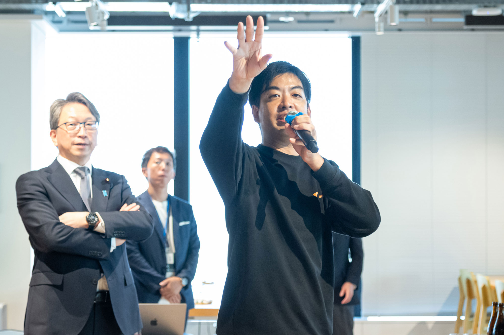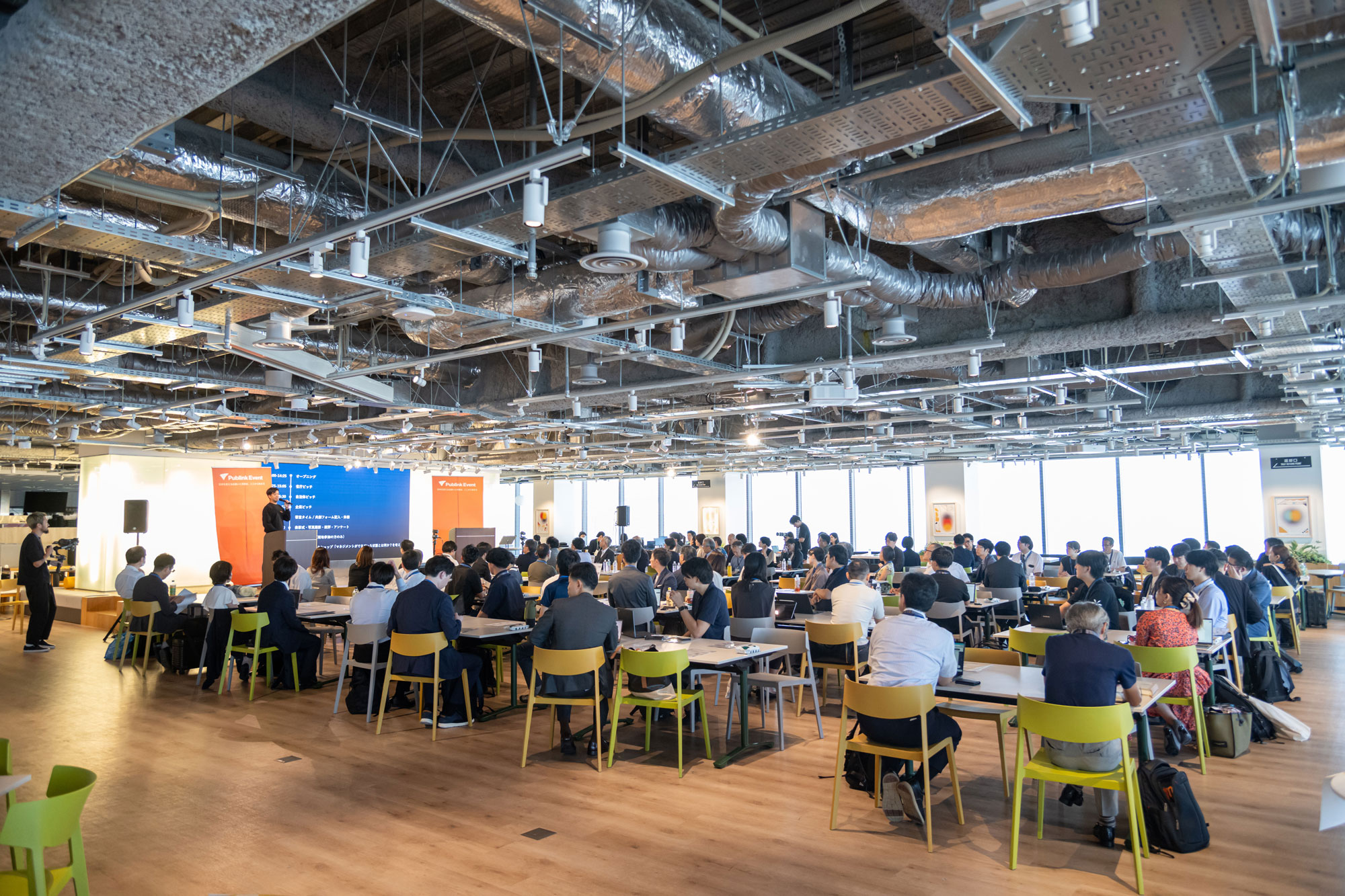 実は今回の会場は、ソフトバンク本社の食堂『カフェシバ』!レインボーブリッジを望む素晴らしい眺望を持つ、おしゃれなカフェを、ソフトバンク様からご提供いただきました。協賛者挨拶として、ソフトバンクの桜井氏は「まさにこの場所は、ソフトバンクグループでもそれぞれの強みを横に広げる会議を行う場所」であること、ここからの始まる共創への期待をご挨拶いただきました。
