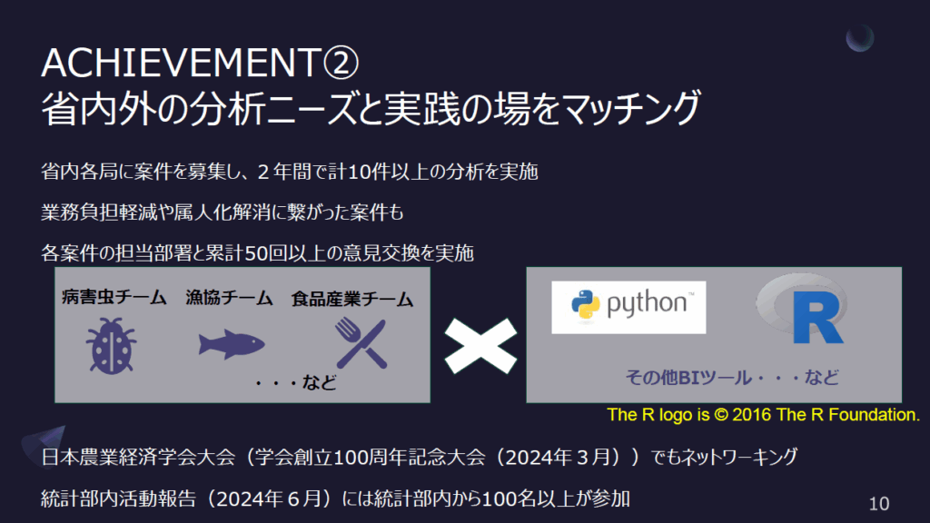 これまでに2年間で10件以上の案件を分析。例えば、病害虫の病害虫発生予察警報、注意報を可視化したプロジェクトでは、BIツール等の活用により、情報の利用者の利便性が向上しました。
