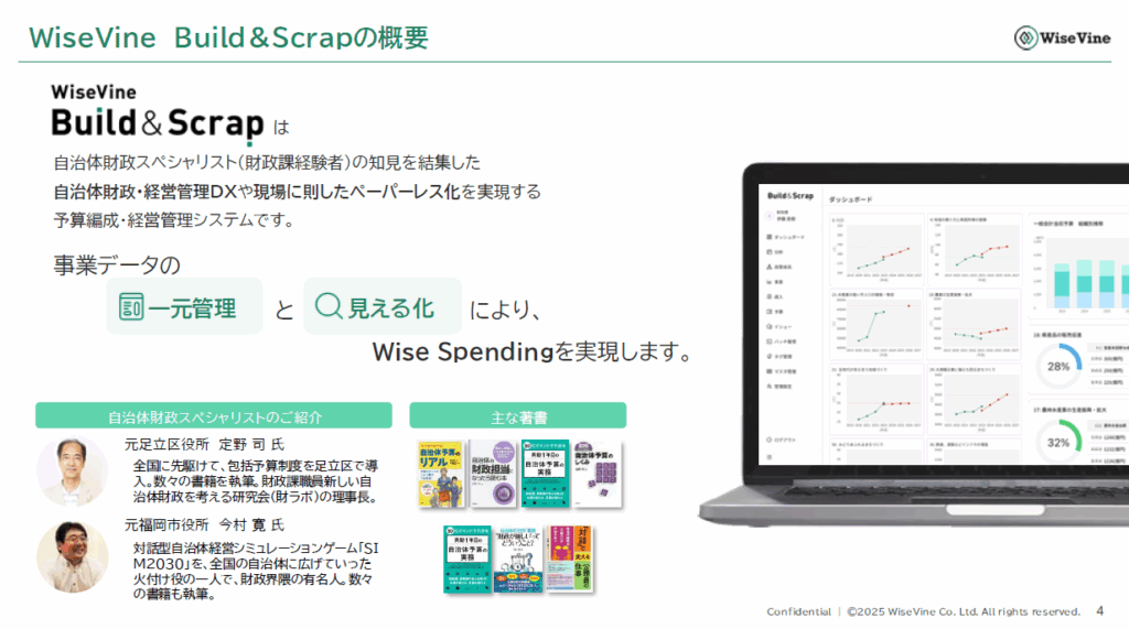 「Build&Scrap」は現場の実務感覚に根ざした経営判断の仕組みを備えていることが特徴です。開発メンバーの3分の1が元自治体職員であり、自治体財政の専門家も開発に携わっています。