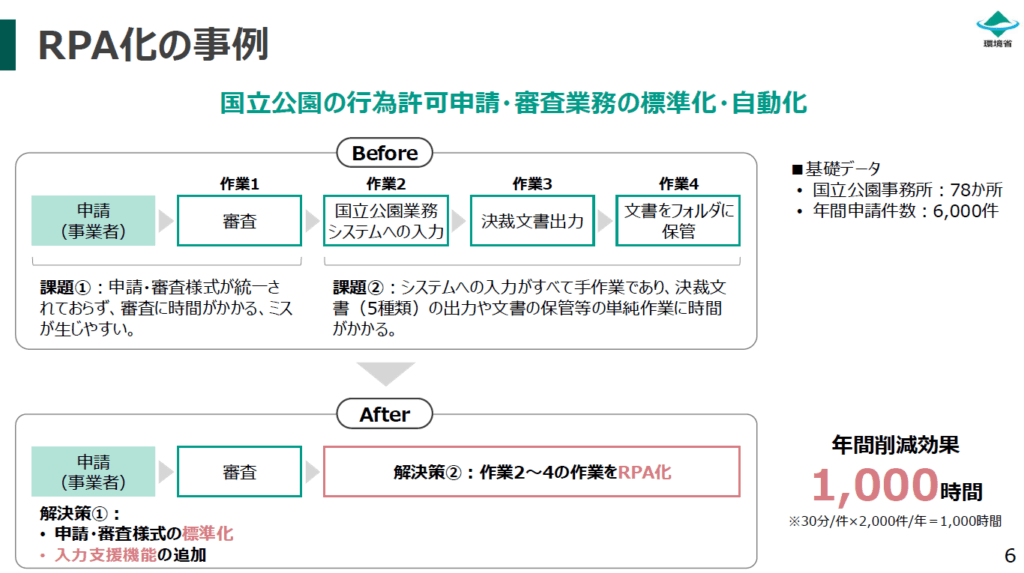 例えば、国立公園の行為許可申請の電子化プロジェクトでは、年間約1,000時間の労働時間削減に成功しています。