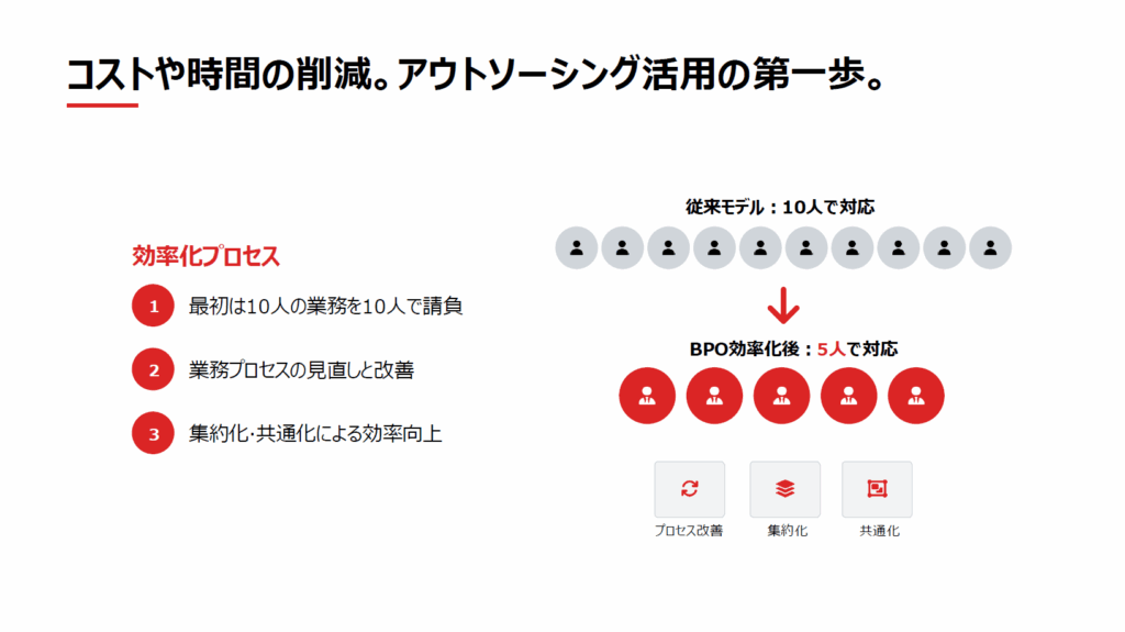 BPOとは、単なる人材派遣やコンサルティングではなく、業務そのものを専門チームが代行し、プロセス改善・集約化・共通化を進める仕組み。